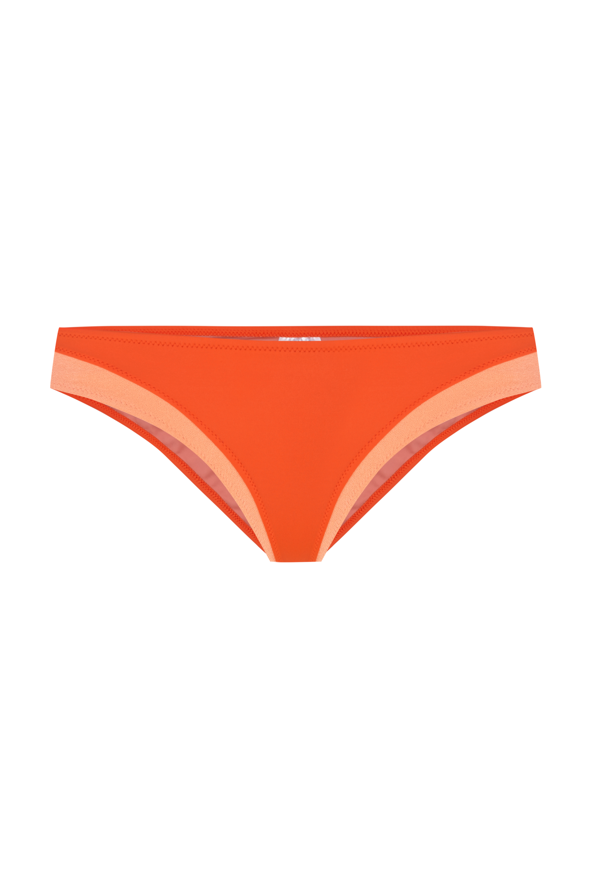 Low rise bikini bottom with contrast panels that creates the illusion of layering.