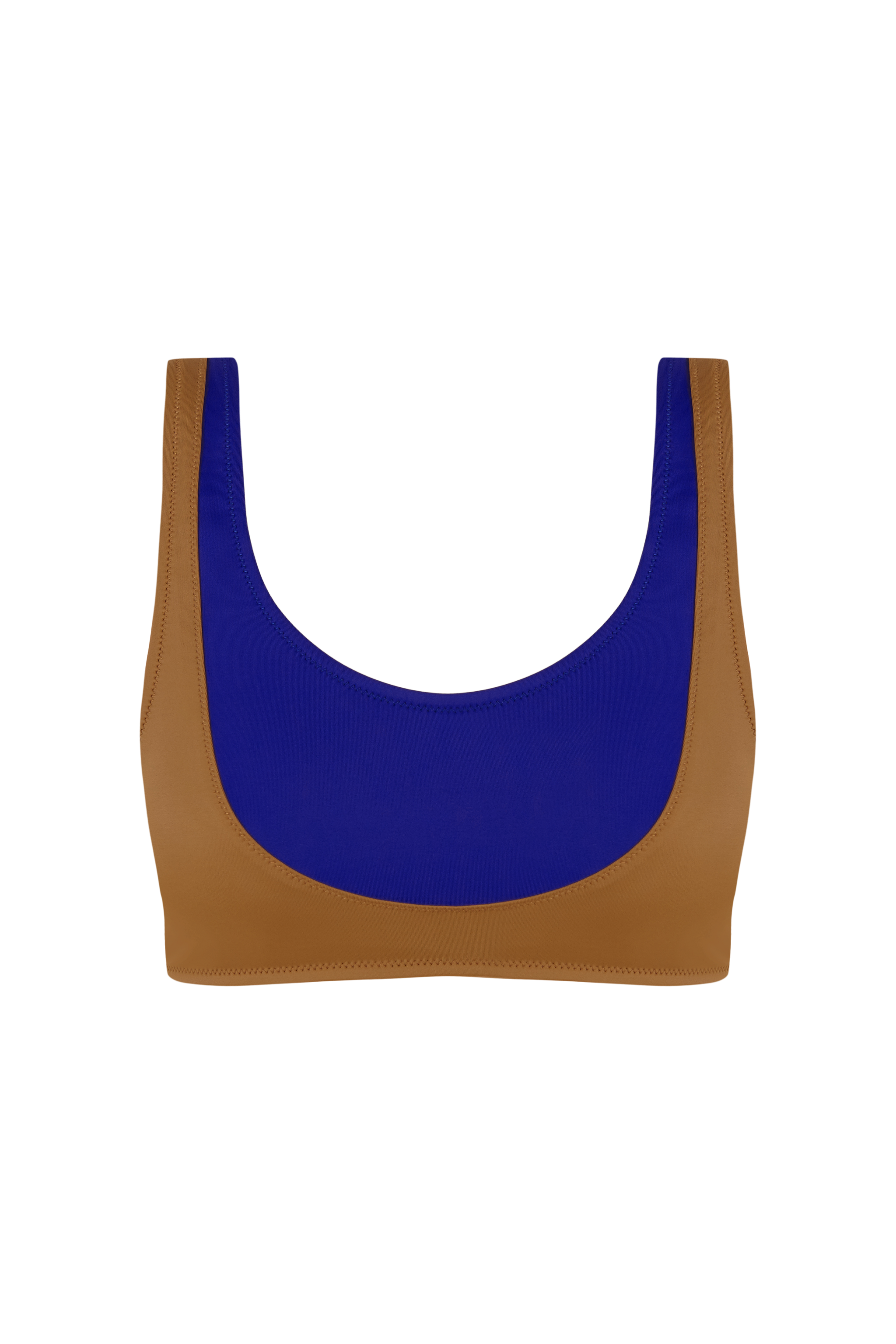 Sporty pull-on style bikini top featuring a contrast in front that create the illusion of layering. Non-padded and no cups.