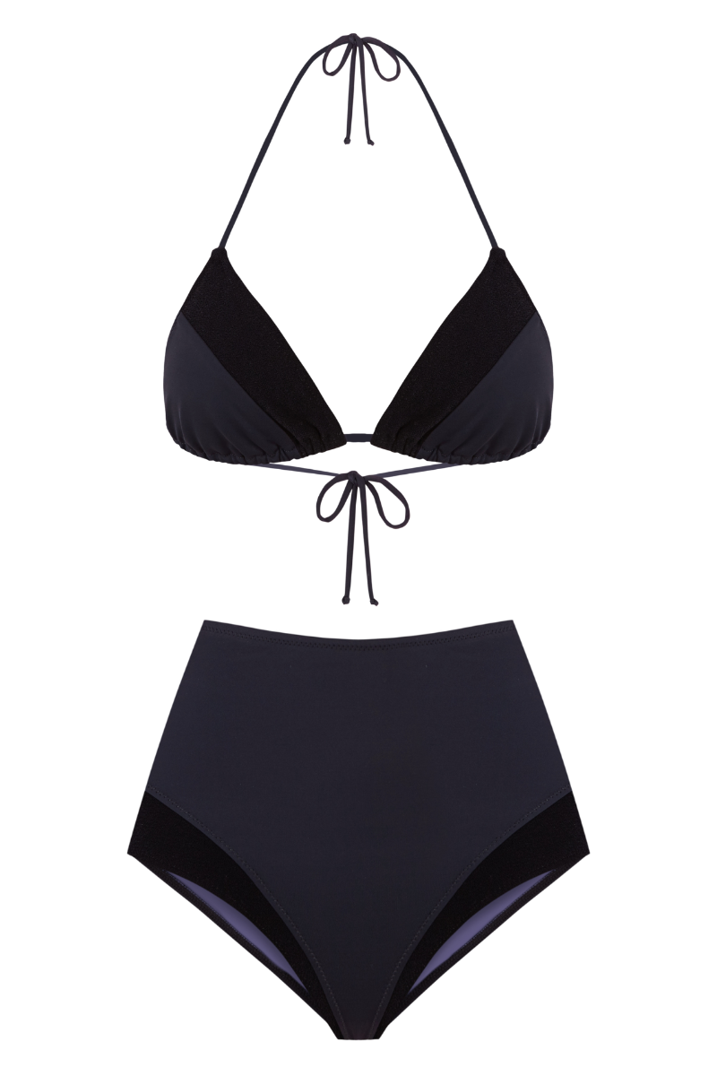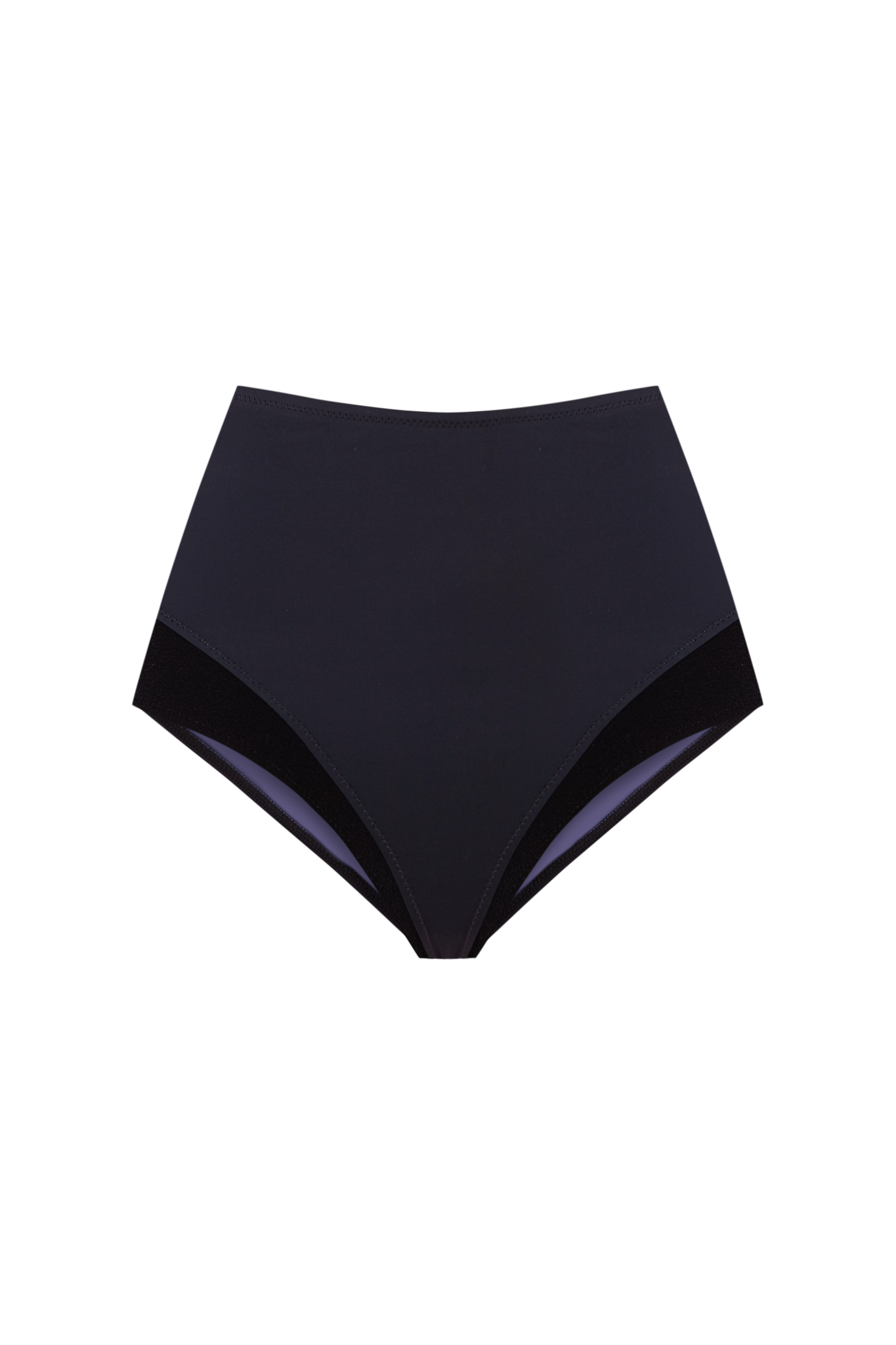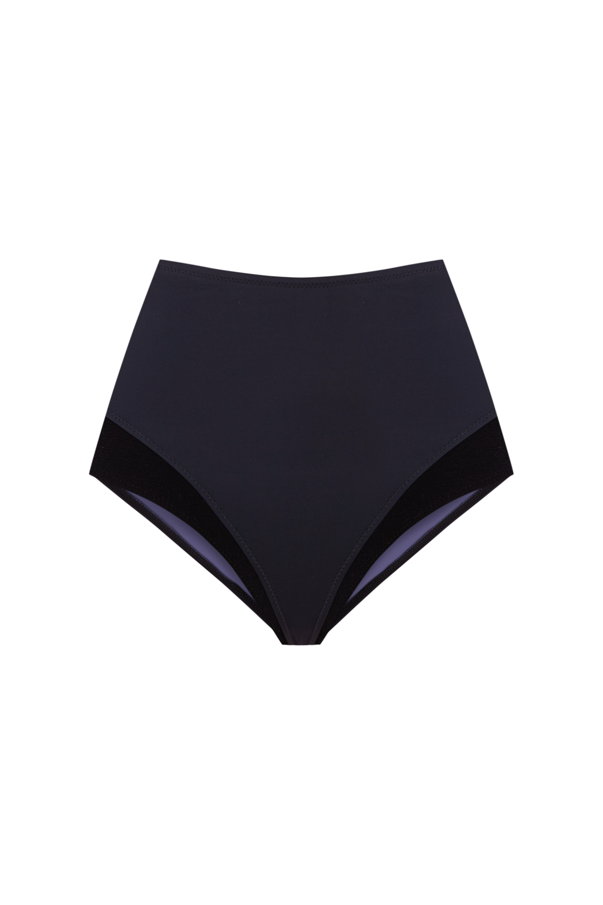 A high-waisted bottom featuring panels that create the illusion of layering for a sculpted look. The Midnight Black Lycra fabric is paired with Black Terry cloth panels, offering a unique texture contrast.