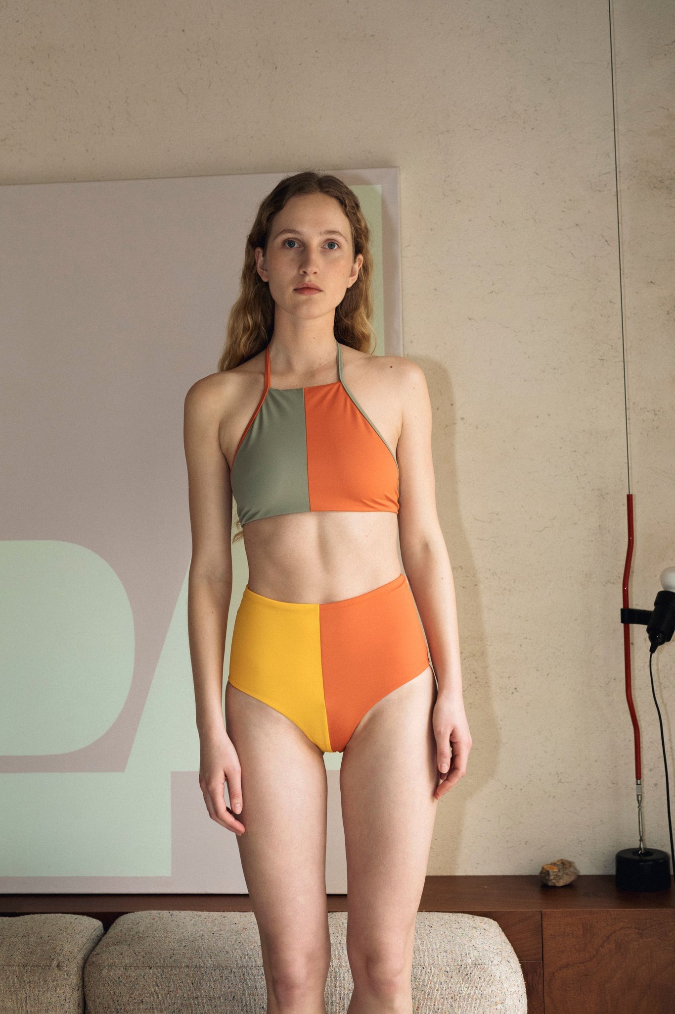 High halter top with adjustable back and neck straps. Non-padded and no cups. Self lined interior.